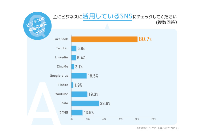 Facebookの次は、ベトナムのSNS「Zalo」、youtube、Google plusと続いた。Twitter 5.8%、Linkedinは5.4%。
