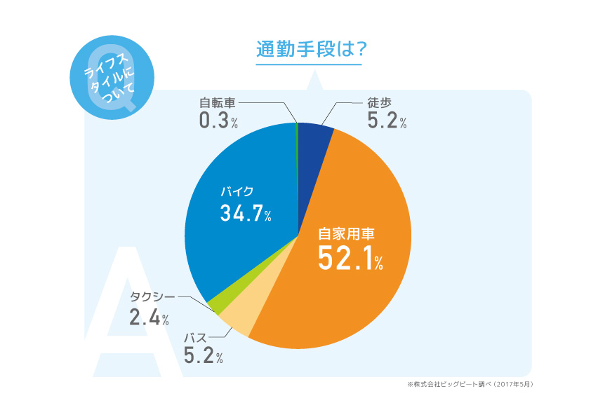 こちらも聞いてみました。ビジネスパーソンの通勤手段は、「自家用車」と「バイク」