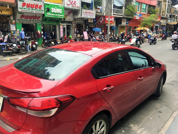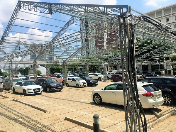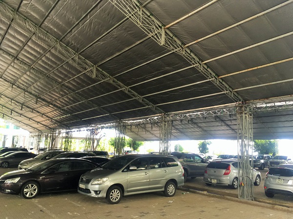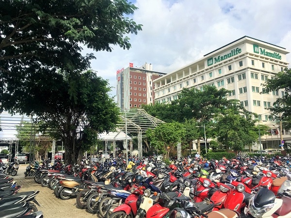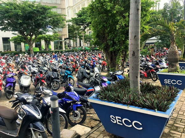 まだ都市交通は整備中のホーチミン市内。移動は主に車です。2017年5月に実施したアンケート調査では回答者の約半数が自家用車で、約2割がバイクで来場していました。駐車台数500台(二輪車1300台)あるそうで、会期中の駐車場はこんな感じになります。