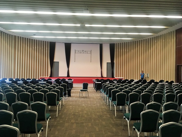 1Fは展示場ですが、2Fにはカンファレンスホールがあります。楕円形のホールは530㎡、シアタースタイル(椅子席)で500席の広さです。
