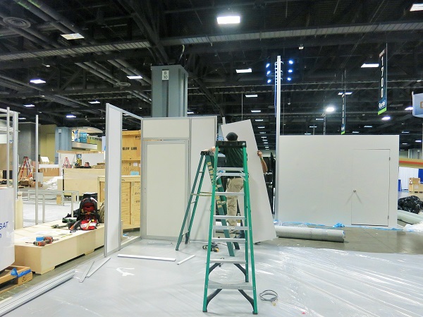 アメリカでは使いまわせるシステムや既存資材でつくるブースが多く、日本でよくみられる木工ブースは少ないそうです。