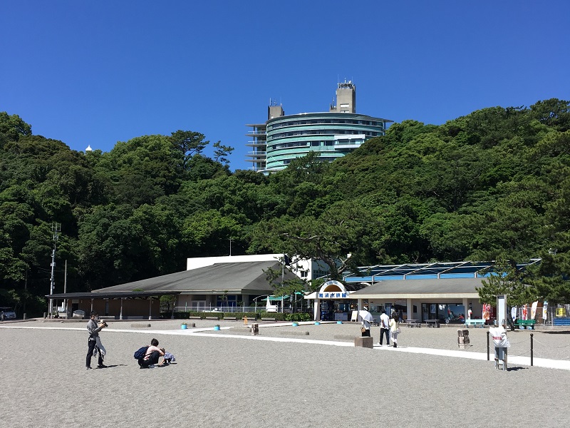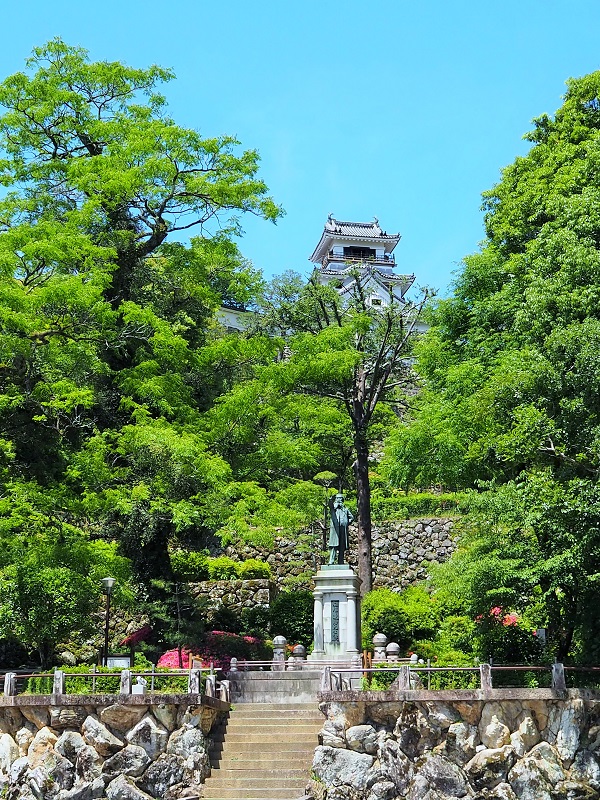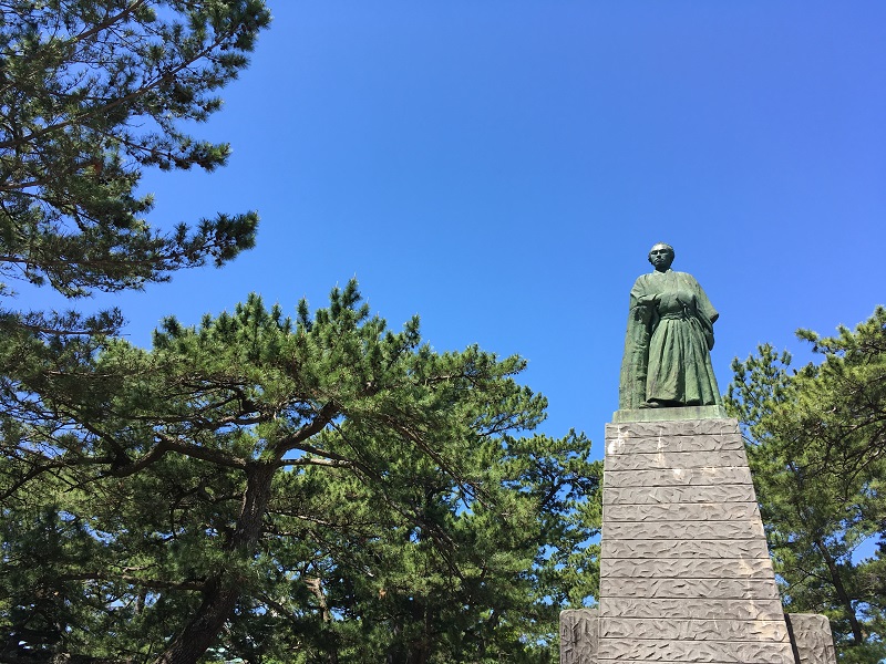 浜辺から階段を上ると有名な坂本龍馬像が。海を眺めてます。