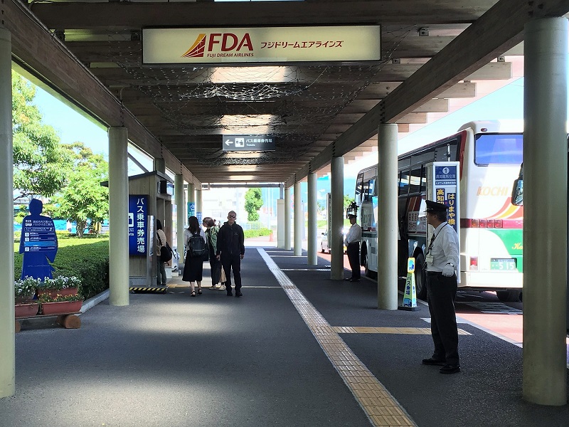 空港からはバスで市内に向かいます。券売機でチケットを購入して、終点高知駅まではおよそ25分。