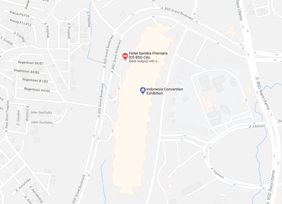 ICEはインドネシア ジャカルタのすぐ西隣、バンテン州の都市、南タンゲランBSD Cityに位置しており、渋滞がない場合にはスカルノハッタ国際空港(CGK)からタクシーで約45分ほどです。ICEの北はジャカルタのALAM  SUTERAという、買い物やレストランが多い人気なエリアがあります。