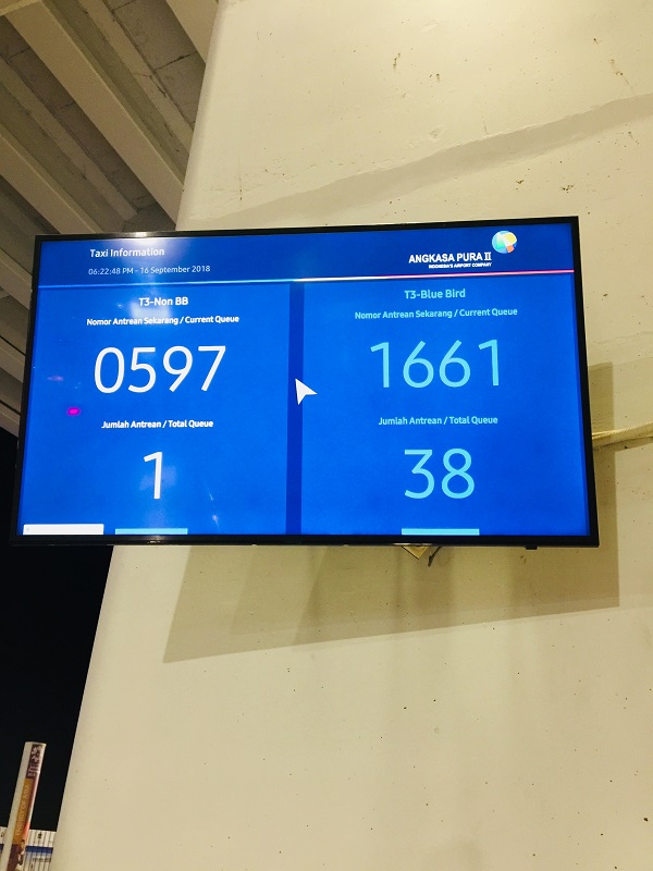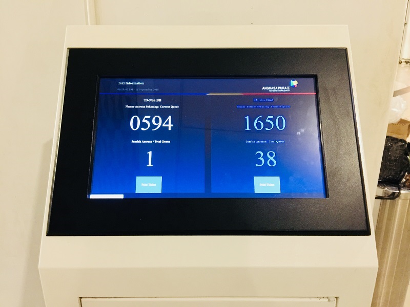 お金を両替した後に、外に出て、左側真っすぐに向かうと、いくつかのセルフサービスチケット発行機が見えます。機械の画面には、二つの選択肢があります:ブルーバードタクシーとブルーバードじゃないタクシーです。そして、その下には現在、タクシーを待ち人数が表示されます。