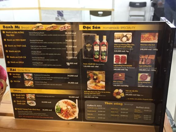 コンボサンドイッチとドリンクで50,000 VND(約250円)です!サンドイッチの他に、xoi(ソイ)というもち米料理や軽食もあります。