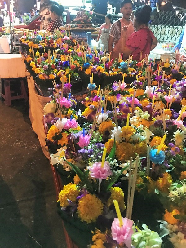 タイ版灯篭流しで、かわいい花やキャラクターなど、趣向を凝らしたいろんな灯篭が路面で売ってましたね。