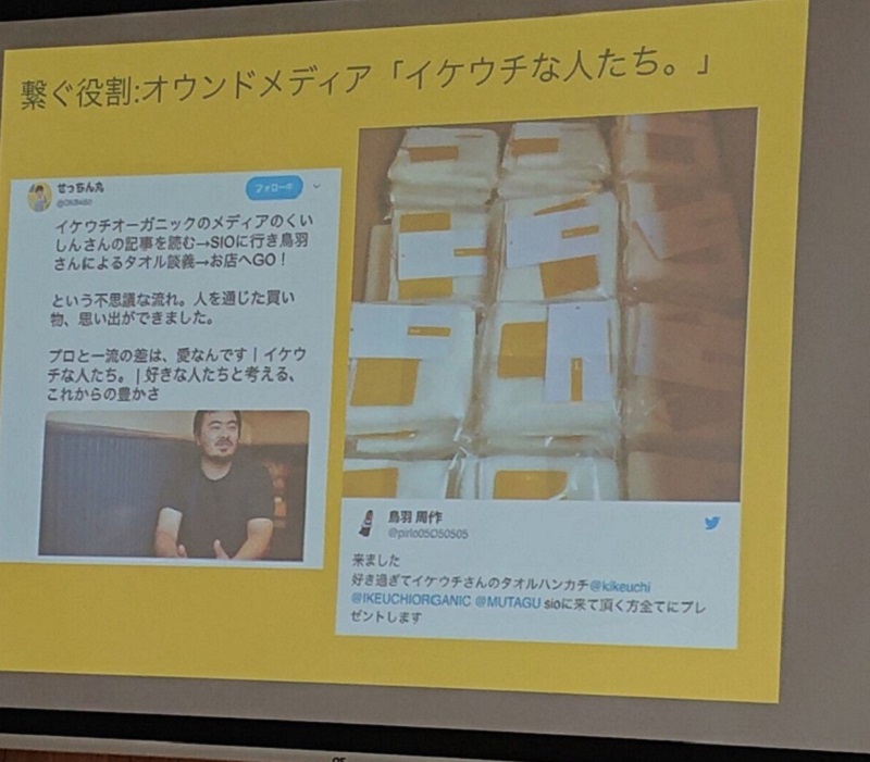 とても印象的だったのは、特別講演で登壇されたIKEUCHI ORGANIC株式会社牟田口さんのお話。お話を聞いた後、私も、IKEUCHI ORGANICさんの今治タオルを購入したくなりました。私自身も1つのプロダクトのコアなファンであるため、このIKEUCHI ORGANICさんの取り組みに対するファンの気もちへ非常に共感できました。コアなファンが何を求めているのかを的確に理解し、その気もちに応えようという熱量が印象に残りました。