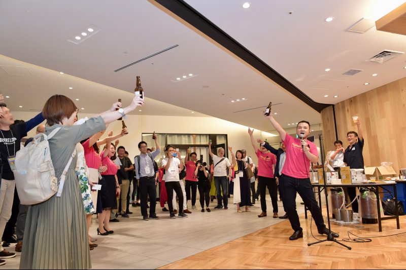 濱口のクロージング挨拶が終わると同時に、スタッフが一斉に会場内へ。オリジナルビールが参加者の皆さんの手に渡ったところで、会場中央にギュッと集まってもらい、スタッフもビール片手に全員集合!