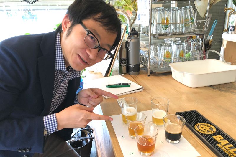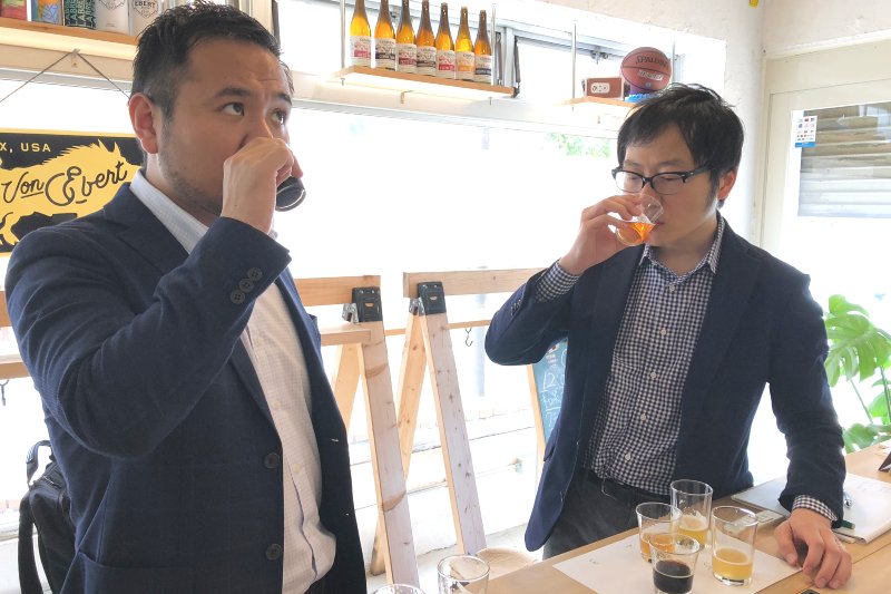 オリジナルビールの方向性を決めるため、和泉ブルワリーさんでつくっているビールを全種類試飲し、3種類まで絞り込みます。スーツ姿で真面目にテイスティングする野北と瀬川(通称・グルメガネ)。