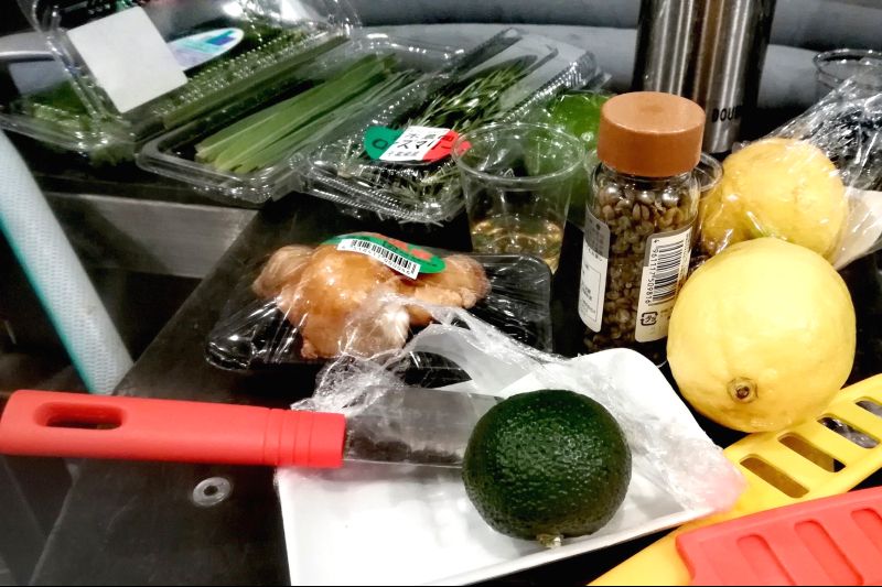 左上奥から時計回りにアップルミント、レモングラス、ローズマリー、ライム、レモン、ぶどう山椒、ゆず(高知産)、生姜
