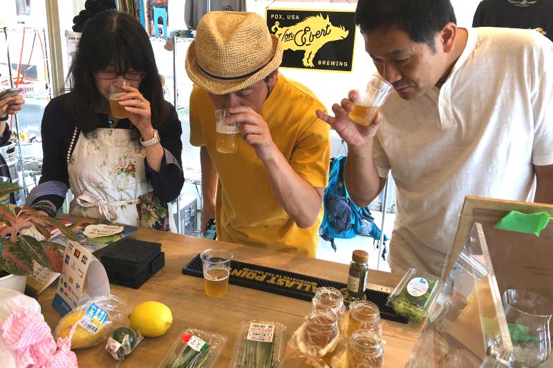 1時間ほど煮沸する間、フレーバーのテイスティング大会を実施!和泉ブルワリーさんにお願いして、ベースビールとなるラガービールに、前日からハーブやスパイスを浸けこんでおいてもらいました。さて、どの組み合わせがいいかな?