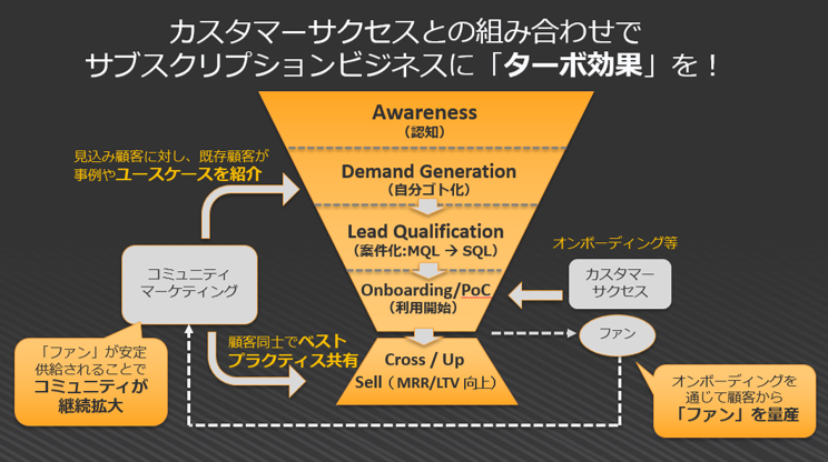 さらに小島さんは「カスタマーサクセスとコミュニティマーケティングは切っても切れない関係」と話し、上図のようなマーケティングファネルをつかって説明するとわかりやすいと話します。