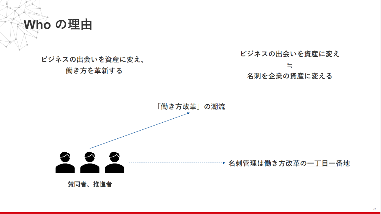 この時の導入社数は約4,000社。ちょうど働き方改革が叫ばれた時期でもあり、Whoを「働き方改革を推進するイノベーター」とし、Whatを「名刺を企業の資産に変える」と再定義。