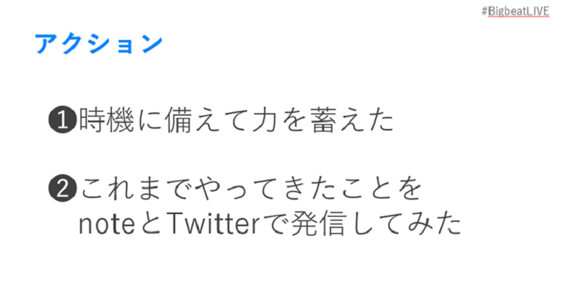 新卒からDNP一筋でビジネスキャリアを築いてきた山口さんですが、社内での異動は多く、様々な部署や職務に従事してきたといいます。その経験を「ちゃんと伝えていこう」と思い始めたのが40代のこと。そんな中、Bigbeat LIVEで登壇者の「勝手にアウトプットしたら人生が変わった」というお話を聞き「これだ!」と40ページくらいある“遺言”を作り始めます。その内容は3年間マーケティング企画本部長に従事する中で部下たちに言い続けてきたことで、それらを残しておきたいという想いからでした。