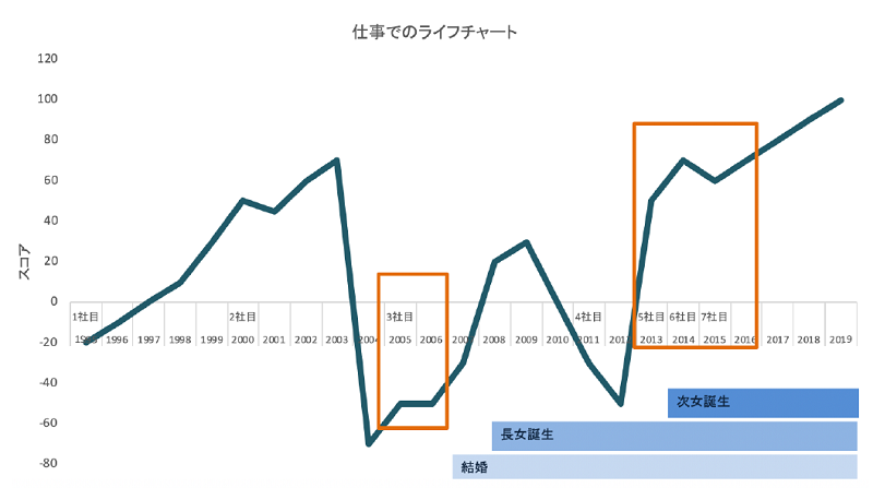 一流企業で活躍されていた華やかな経歴をもつ植山さんですが、2006年頃は「できない自分」を痛感して落ち込む毎日が続いたそう。しかしあるとき、上司に言われたひとことをきっかけに「人生を変えたい!」と思い、ビジネススクールに通い始め、そこで学んだことを次の日から実行するということを繰り返しました。その結果、仕事の質が向上したといいます。浮き沈みのある自身のライフチャートを示しながら、「ジャンプする前には大きく下がっているんです。高く飛ぶときはしゃがみますよね。でも、話したいことは、どん底の苦労話ではなく『トンネルは永遠に続かない』ということ」と語る植山さん。