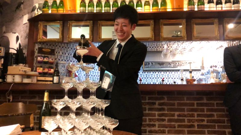 入社式で大好きなお酒をそそいでゴキゲンな加藤