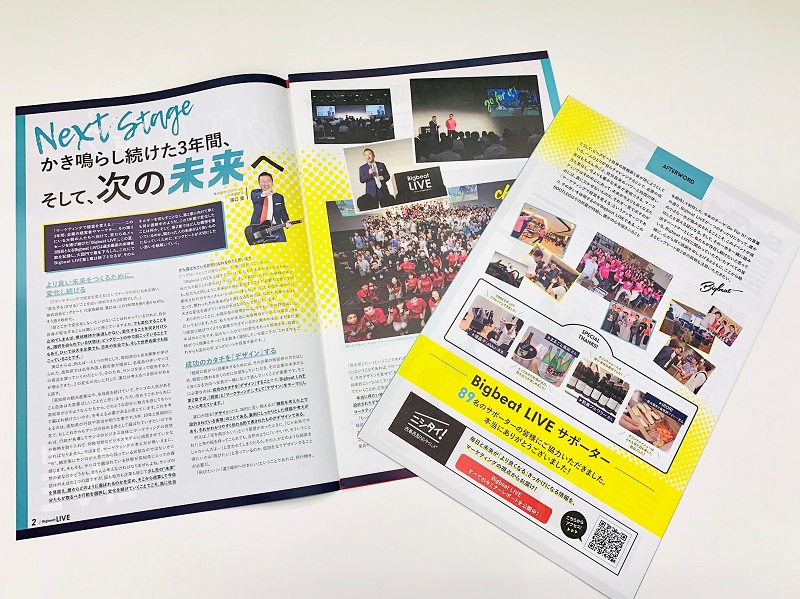 最初の濱口の挨拶のページは「これまでのBigbeat LIVEについて」「これからのBigbeat LIVEについて」の2つの構成になっています。執筆にあたっては濱口の話を聞き、本当に言いたいことを表現できているのかと自問自答しながら、自身の言葉に置き換えていきました。