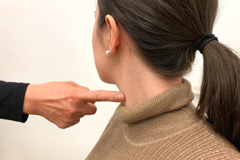 イスに座った状態で背筋を伸ばし、体の向きはそのままに、あごを引いた状態で鼻先から横を向きます。その時、振り向いた側と反対の首筋に浮き出る筋肉が胸鎖乳突筋です。