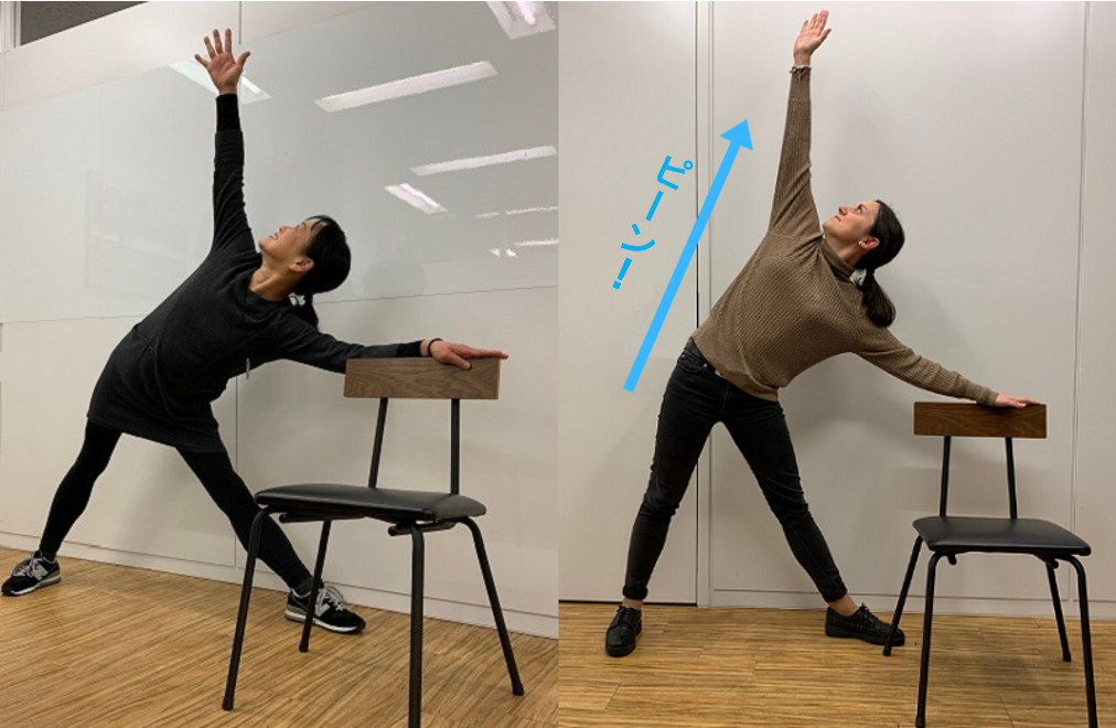 少しポーズを深め、立ってイスにつかまって行う三角のポーズをやってみましょう。
