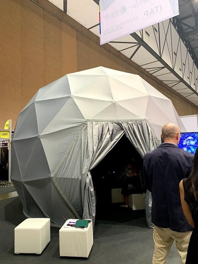 恐る恐る中に入ってみると、、中は全体が360度ドームモニターになっていました。こちらのドームは教育やイベント、ポータブルプラネタリウムとして活用ができるそうです。これまでには中国でのヨガイベント、ロシアでのコカコーラのイベント等での活用歴があります。