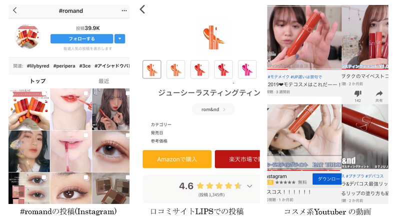 冒頭でも述べたように、現在インフルエンサーを活用したプロモーションが目立ちます。例えば、2019年SNSで爆発的な人気となったrom&ndの「ティント」。ティントとは、一度塗るだけで唇の水分に反応して鮮やかな発色がキープできる特徴を持つリップのことです。韓国では主流のコスメで、オルチャンメイクの流行と共に日本でも使っている人が増えています。