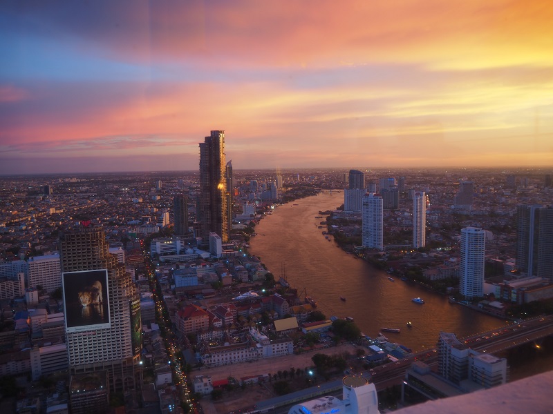 高層ホテルの窓からバンコクの街並みを眺めながら、