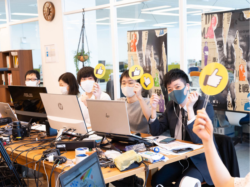 いいね!マークの付いた棒は、スタッフ全員に配られた。オンラインでも場を和ませたり、盛り上げるためのちょっとした工夫の1つ。