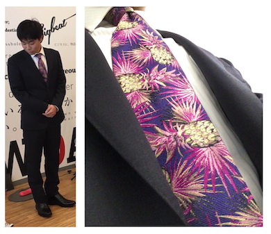 4月1日の入社式当日、何を思ったかパイナップル柄のネクタイで参上して以来、芸名はパインとなる。