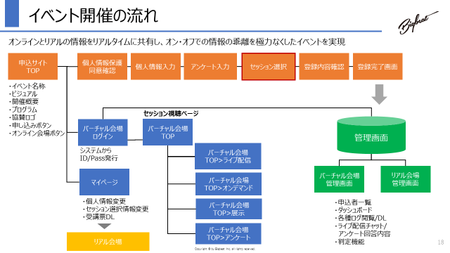もちろん今までもハイブリッドイベントは対応可能でしたが、システムが分かれているため、例えばオフラインで参加予定だった参加者が急な事情で当日にオンラインに切り替える、とした場合に再度オンラインに登録をしなければならなかったのです。