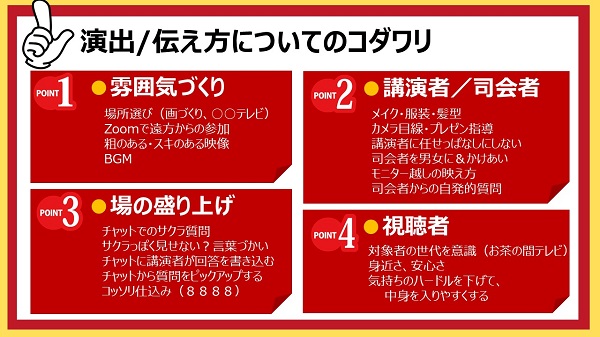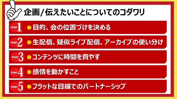 さらに、「講演者の熱量をより伝えられるのは収録より、生配信が適している」と感じたこともあり、生配信を多く選ぶようになったと言います。こうした目的や配信手法など、企画骨子の部分に時間を割くためにも、業務をアウトソースする必要性にも触れながら、「伝えたいことへのコダワリ」の最後に自分自身が企画を楽しむことの重要性を説きました。