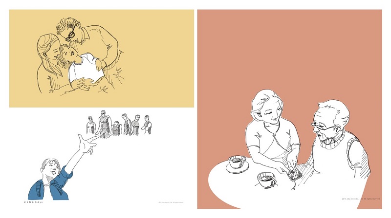 平田さんは13年前、来日中のそのメーカーのアジア圏の責任者と知り合い、自主提案の機会を得ることができました。そこで用意したのが、8枚のスケッチ。そのスケッチには、就学前の1人の子供と、その子の両親や祖父母の姿が描かれ、周囲の人と関わりながら、その子供が成長していく姿を1枚1枚に描いたものでした。