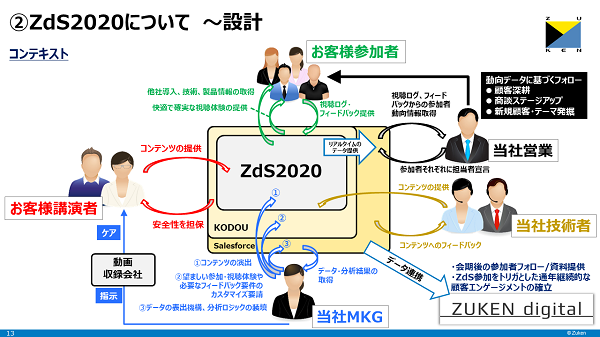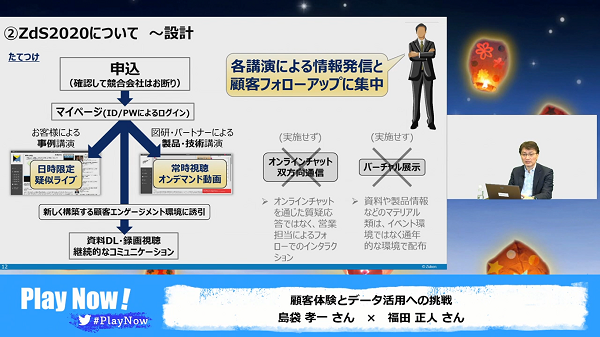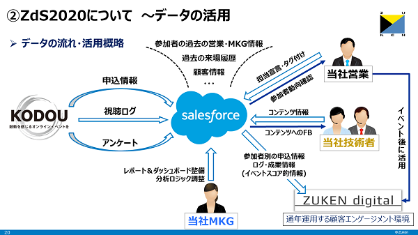 パートナーが決まった後、「まず、集客対象はオフラインと同様としつつ、オフラインでできないことは深追いせず、オンラインならではの特徴を活かして、データ活用や顧客体験づくりをおこなおうと決めた」と福田さんは振り返ります。まず、ZdSでは、オンラインチャットなど、イベント中での双方向性は今回は捨て、代わりにそこで起こった情報をリアルタイムで回収し、期間中にイベント外で営業担当がお客様に連絡をとってフォローアップするようにしました。