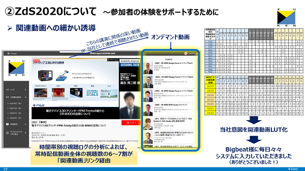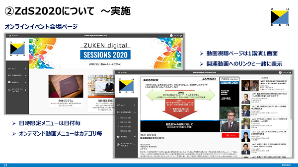 そこで、イベントそのものを「通年運用の顧客エンゲージメントの一部」と捉え直し、10月14日(水)~22日(木) に「ZUKEN digital SESSIONS 2020(ZdS)」と名称を改めてオンラインイベント化。オンラインならではの顧客体験づくりを徹底した結果、 ZIWと比較し、申込者は全体として25%増、イベントの目玉である講演の平均視聴数も増加しました。