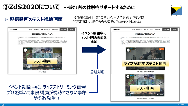 オンラインならではの配慮として、お客様の視聴環境への考慮があげられます。「我々のお客様の多くがメーカーの設計部門ですから、ネットワークセキュリティが高いことは予測できていたので、テスト動画を事前に視聴いただくようにお願いしました」と福田さんは振り返ります。
