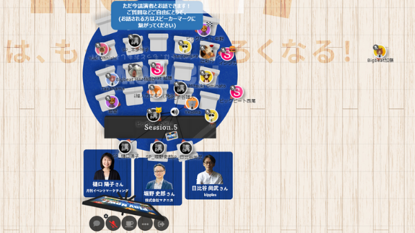 参加者・講演者・主催者が集まり、オンラインの会場内を自由に動き回りながら、会話ができる仕組みをつくりました。初めての取り組みでしたが、正直、予想以上の盛り上がり。「自社のイベントでも使ってみたい!」という声が聞こえてくるなど、嬉しい結果となりました。今回は1時間×2回で実施しましたが、特に講演者への質問・交流が活発に行われたことからも、セッション直後に15分ずつでも時間を設けられるとよさそうです。