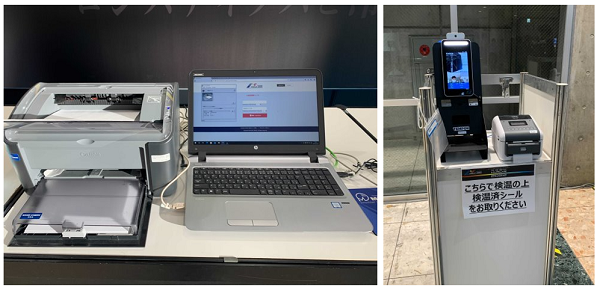 まずは入り口ですが、コロナ禍で定番になった無人の来場者システムを設置。オンラインで登録を済ませ、事前に発行したバーコードを読み取り、来場証を受けとるフローです。このHVAC & R JAPAN 2022独自の試みと思われるのは、体温検査済みを証明するシールを来場者証に貼る必要があること。入場時に体温検査をしてパスをした人がシールを受け取り、シールを印刷した来場証に張ります。入場してみると、目につくのは出展キャンセルにより空いてしまった広大な空間です。特に大きな小間での出展を予定していた企業のキャンセルが多かったので、「空いている」印象を受けました。混雑具合は、蔓延防止宣言が出ていたタイミングということもあり、会場内はまばらな印象。実際、展示会終了後の来場者速報を例年と比較すると来場者数は約8割減など、集客面では非常に厳しい状態だったと言えます。